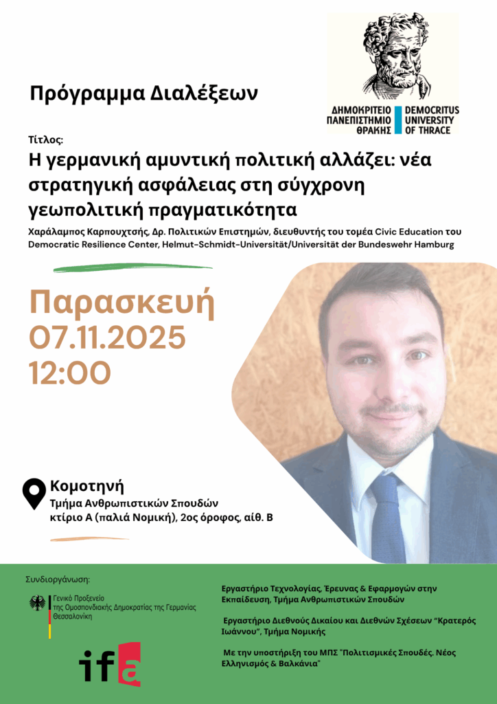 Το Εργαστήριο με χαρά σας προσκαλεί σε διάλεξη με θέμα: “Η γερμανική αμυντική πολιτική αλλάζει: νέα στρατηγική ασφάλειας στη σύγχρονη γεωπολιτική πραγματικότητα”.